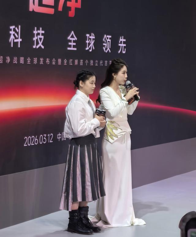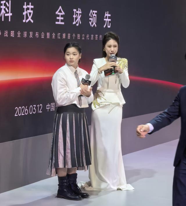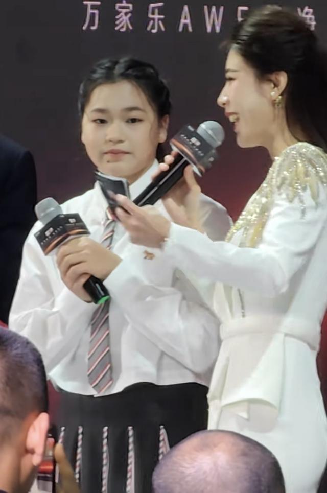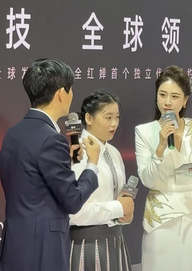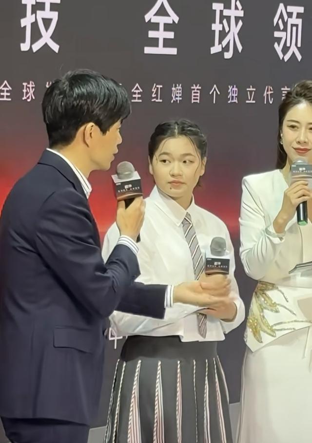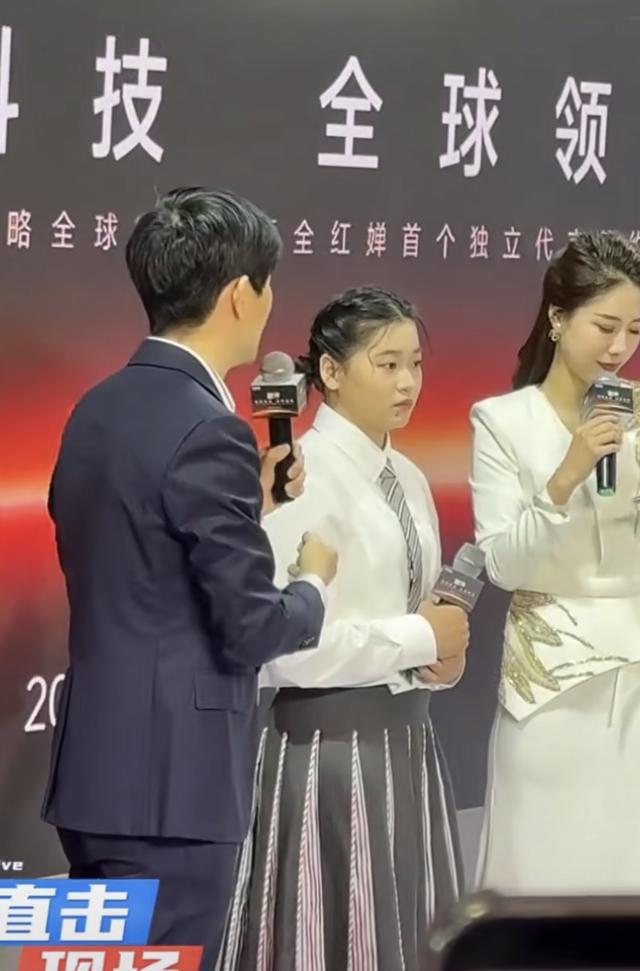 在见面会上,全红婵站在两位主持人中间,她手里拿着话筒、表现的落落大方。