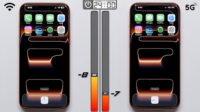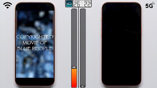 最终的Disney+串流测试成为分水岭。高解析度影片持续下载对网络与电池形成双重压力,5G机型仅支撑22分钟即宣告关机,WiFi版本仍保有25%电量。