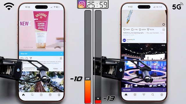 随后16小时待机测试两者再度持平,当进入Instagram场景后,情况又开始变化,经历2小时后,5G多消耗约3%,此时5G手机只剩4%电量,而WiFi还有26%。