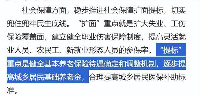 在“提标”方面重点健全基本养老保险待遇确定和调整机制,逐步提高城乡居民基础养老金。可以看出提标下在养老方面分成了城镇职工基本养老保险以及城乡居民基础养老金有着两种不同方向的“提标”。