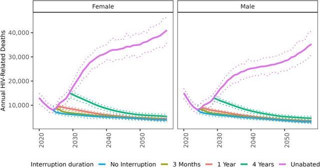 双边援助中断持续时间不同(3个月、1年、4年或持续)对赞比亚年度艾滋病死亡人数的影响